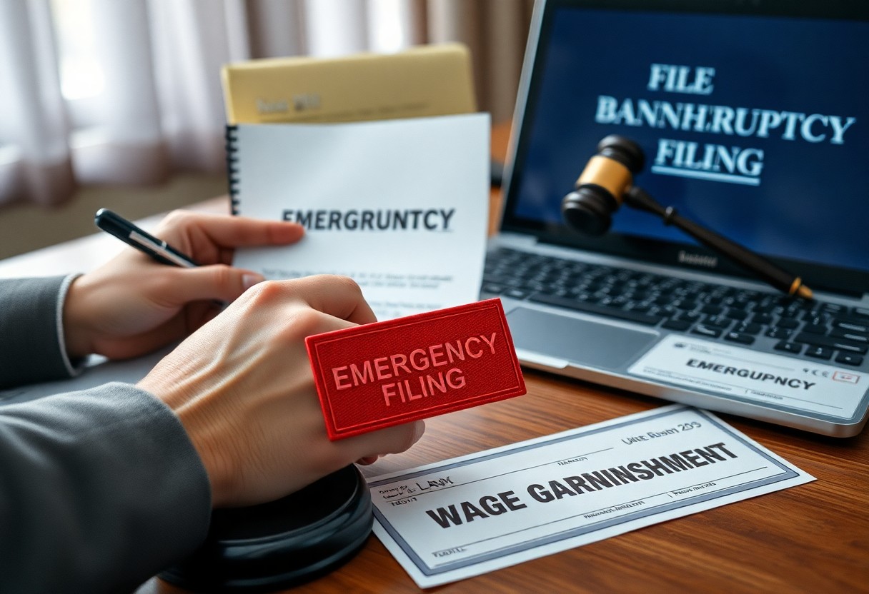 Overwhelmed by wage garnishment, you can halt deductions immediately by filing an emergency bankruptcy petition that triggers an automatic stay; consult a bankruptcy attorney to prepare urgent paperwork and protect your paycheck.